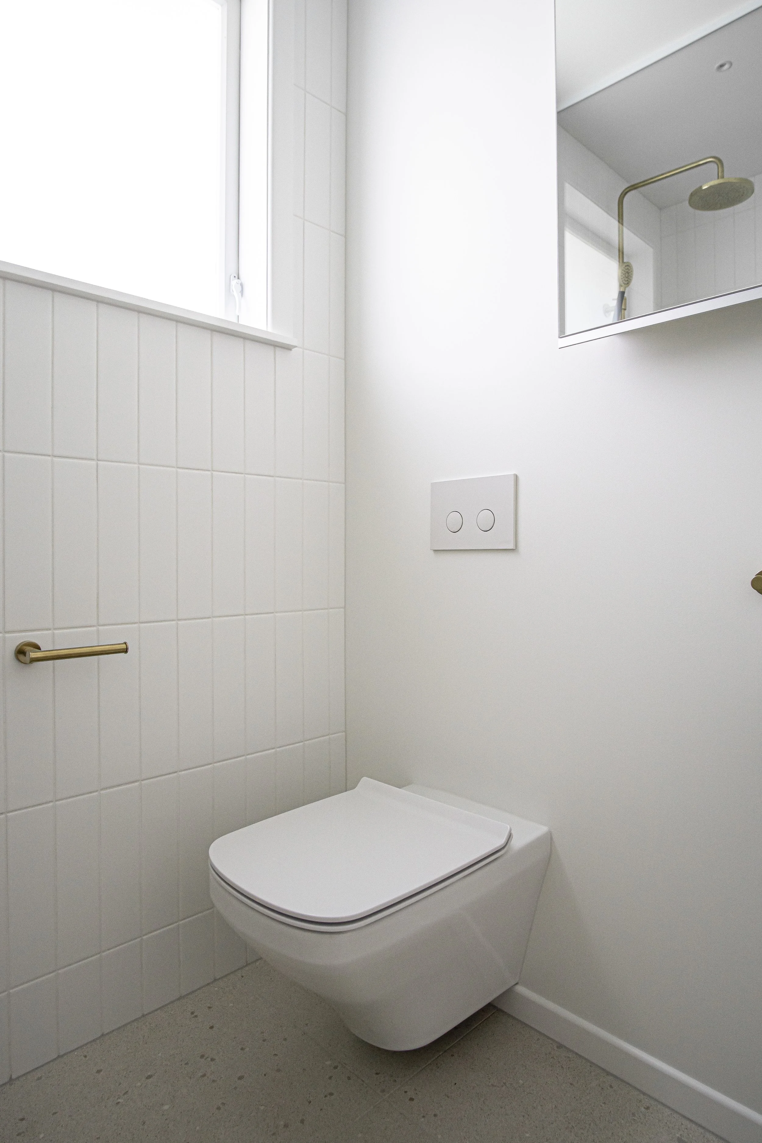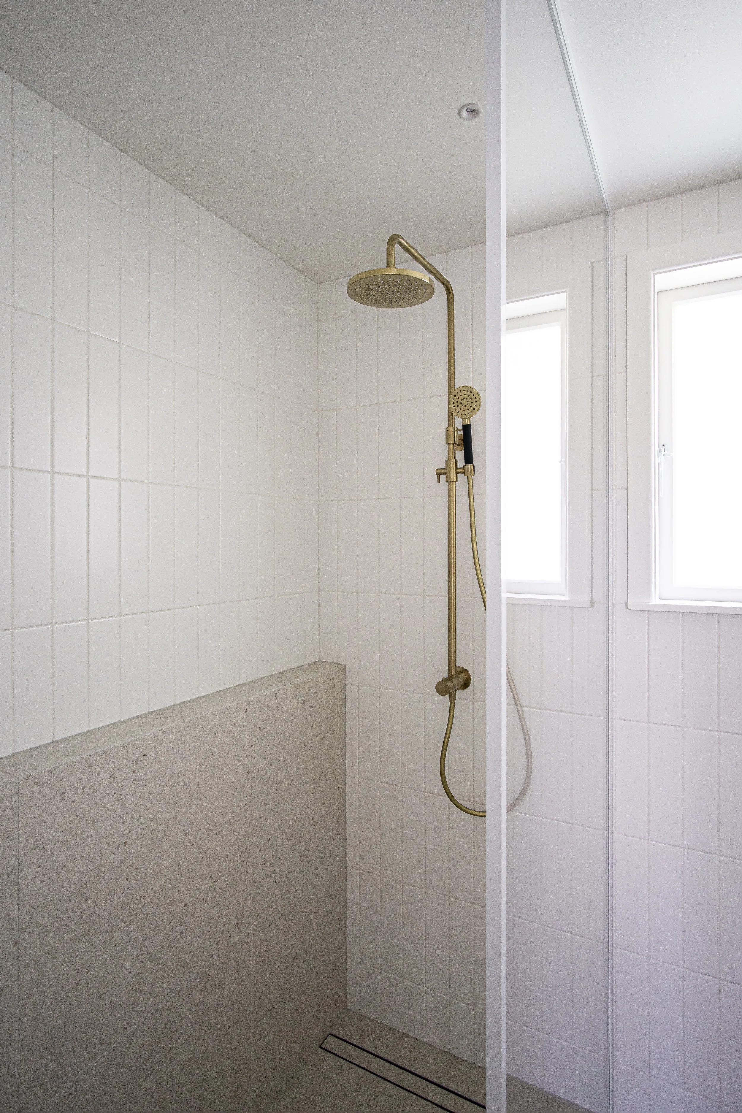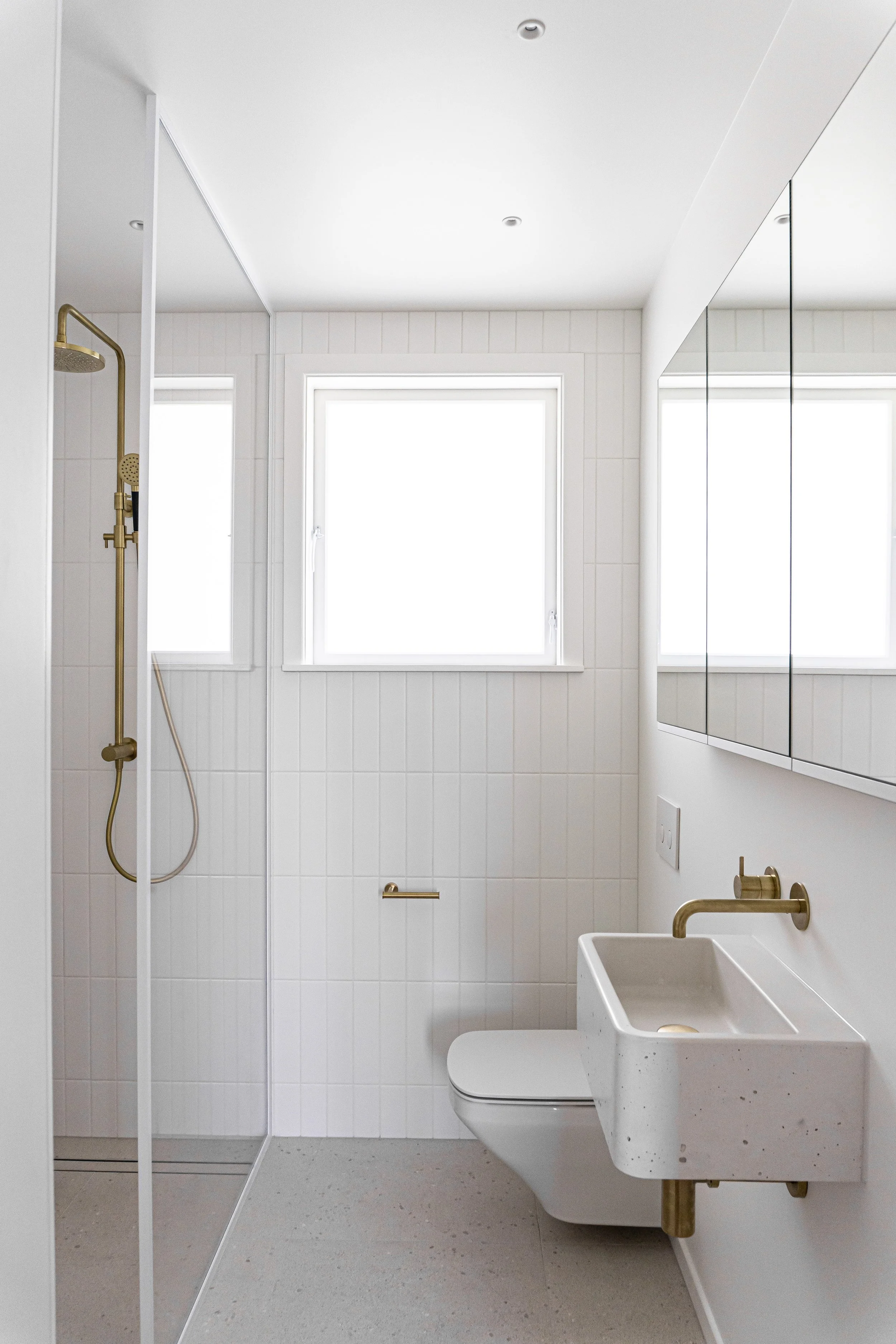 Featuring a walk-in rainhead shower with warm towels within reach, a tactile materials selection and generous storage in the recessed mirror cabinet, this small bathroom ticked all the clients boxes.