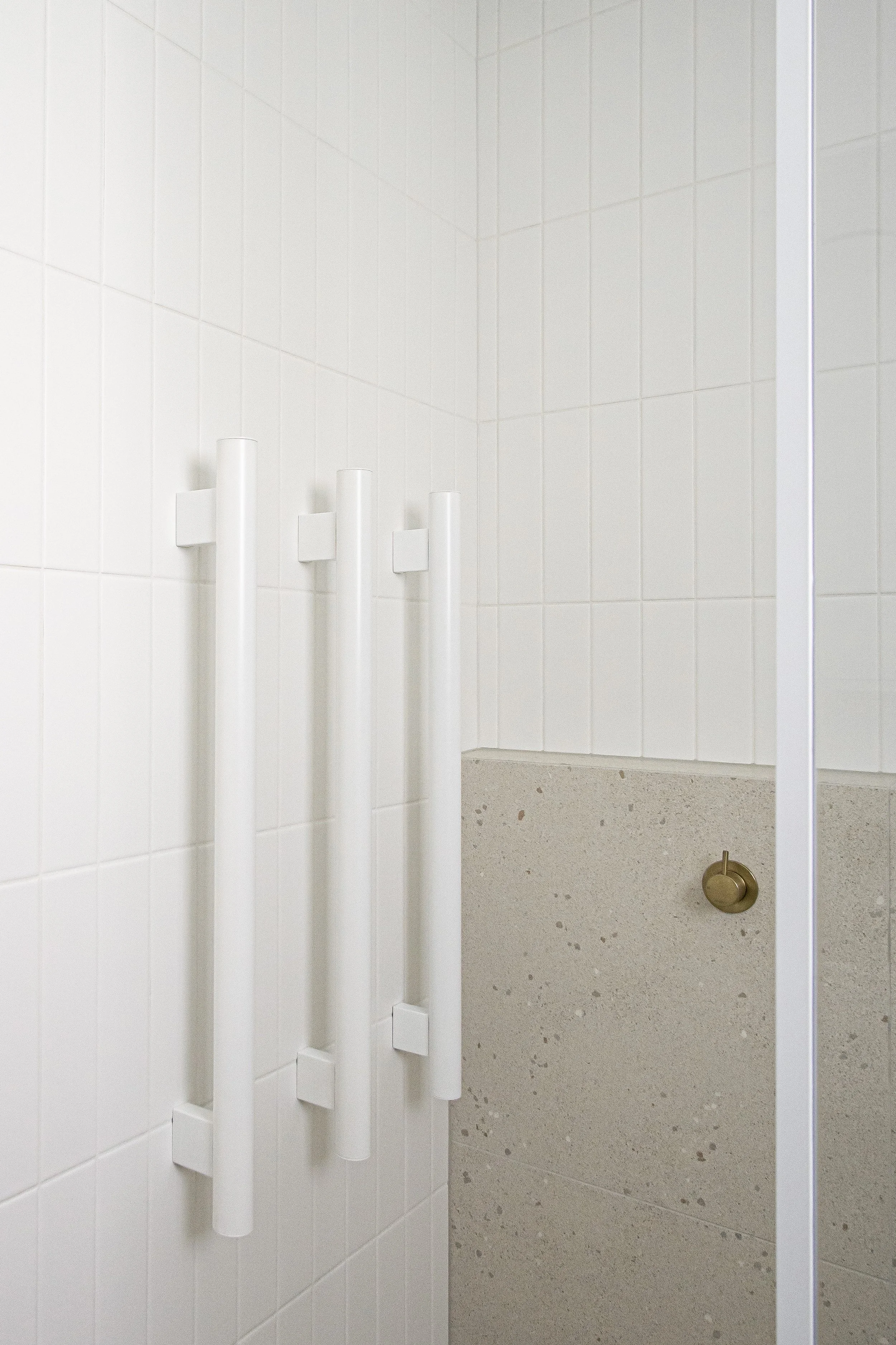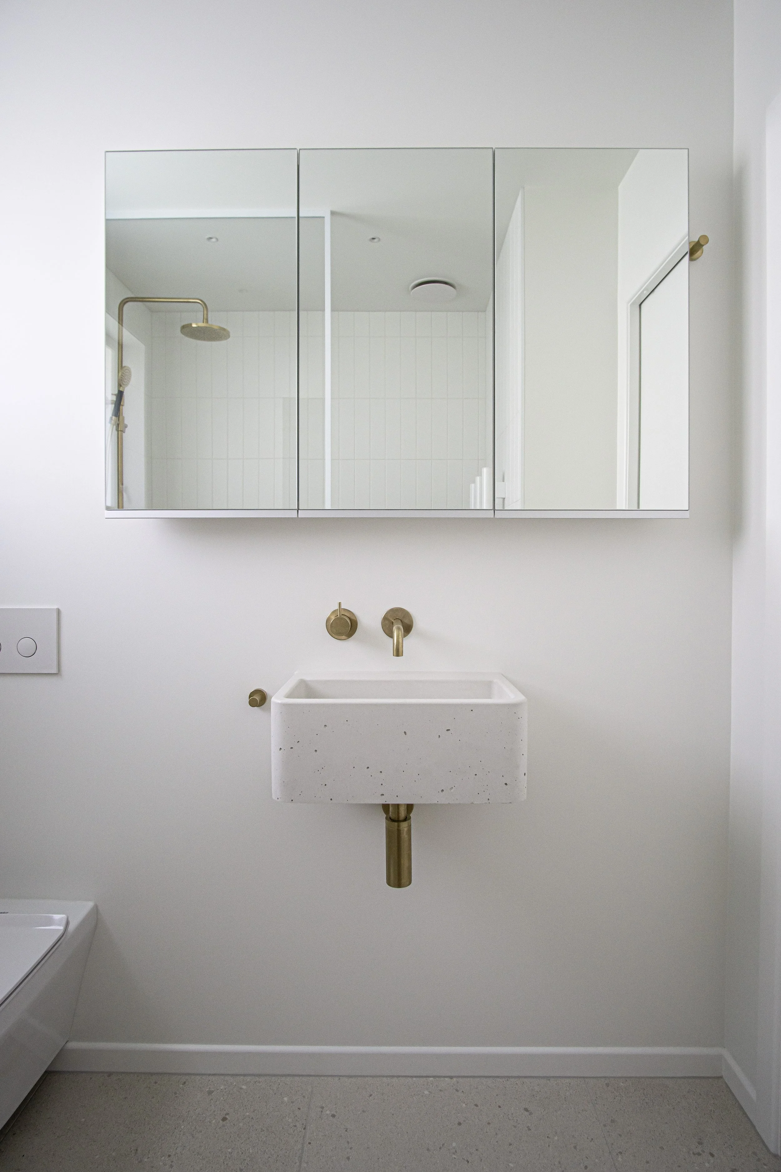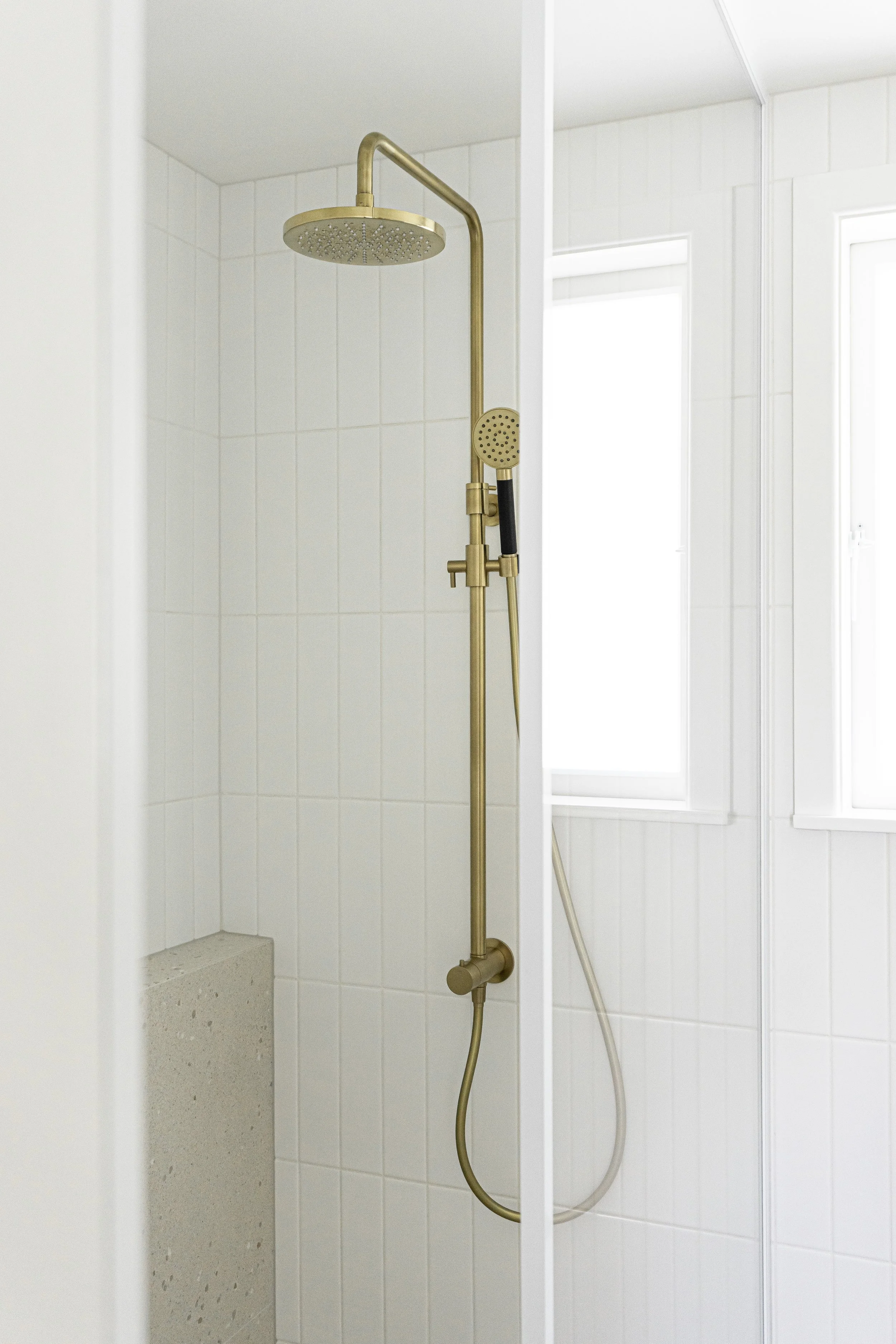 Featuring a walk-in rainhead shower with warm towels within reach, a tactile materials selection and generous storage in the recessed mirror cabinet, this small bathroom ticked all the clients boxes.